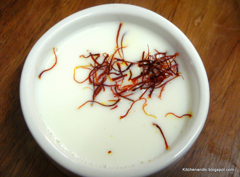 In a very small bowl, take warm milk (about 20 secs in the microwave) and add the generous pinch of saffron to it.