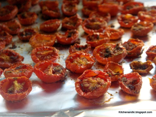 If you are making slow roasted tomatoes at home, you will need to that first. So slice your cherry tomatoes in halves (use regular tomatoes and cut them small if you don't have cherry tomatoes at home). Sprinkle garlic powder (use minced garlic instead if not available), Italian herbs, salt and pepper. Layer on a baking tray and roast in oven for 30 mins till they tomatoes turn sweeter.